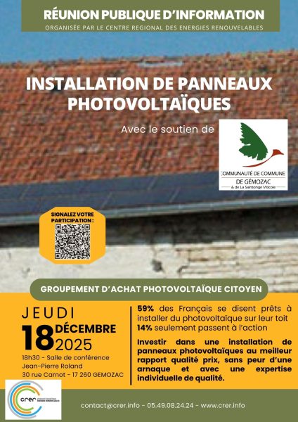 Le Centre Régional des Energies Renouvelables (CRER) avec le soutien de la Communauté de Communes de Gémozac vous propose de participer à une réunion d’information pour l’achat groupé d’installations en toiture de panneaux photovoltaïques.
